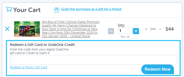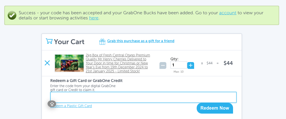 Once you've clicked 'Redeem Now,' the page will refresh and confirm that the code has been accepted. After selecting a deal to purchase and adding it to your cart, simply click 'Redeem a Gift Card' or 'GrabOne Credit.' A section to enter your GrabOne promo code will appear! Enter your code and click 'Redeem.'